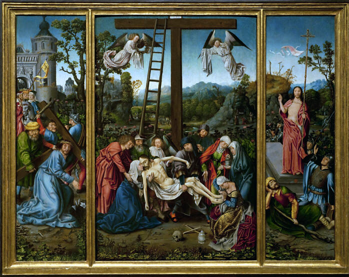 Triptych The center panel shows the scene at Mt. Calvary after Christ’s death,