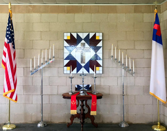 It is kept constantly lit as a colorful beacon and features a cross radiating beams of light, to symbolize the Gospel radiating out from Trinity Lutheran Church & School for over 150 years. The color palette matches the original 1959 Altar Window.