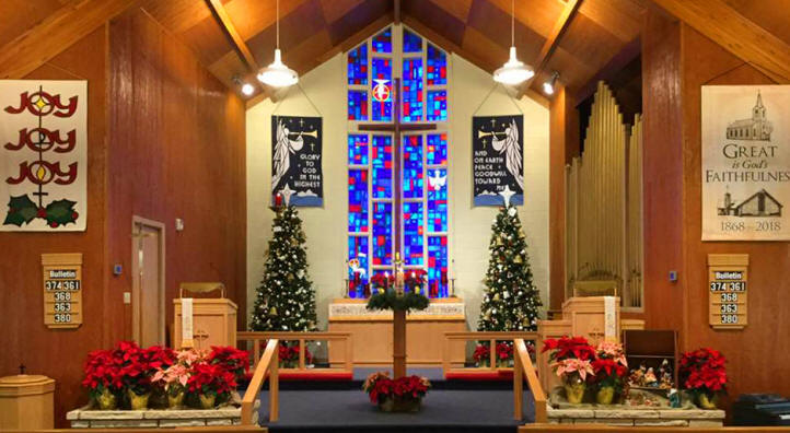 Our beautiful Sanctuary, constructed in 1959, provides a worshipful setting for our services. A special original feature is the large, east-facing stained-glass window above the altar, which floods the Sanctuary with colorful light, and is lit at night as an inspiring testimony to those passing by on Block Road. As a tribute to the name of our congregation this window includes symbols for the three Persons of the Trinity, Father, Son, and Holy Spirit.